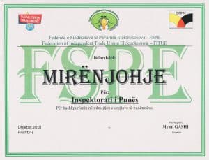 Gjithashtu për Inspektoratin e Punës është ndarë mirënjohje nga Federata e Sindikatave të Pavarura Elektrokosova – FSPE (KEDS), për bashkëpunim në mbrojtjen e të drejtave të punëtorëve.