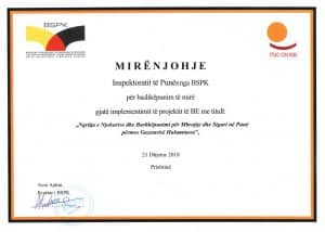 Në këtë kuptim, Bashkimi i Sindikatave të Pavarura të Kosovës i jep MIRËNJOHJE Inspektoratit të Punës për bashkëpunim të mirë gjatë implementimit të projektit të BE-së me titull: